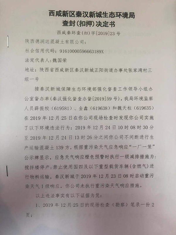 陕西德润达混凝土有限公司查封(扣押)决定书