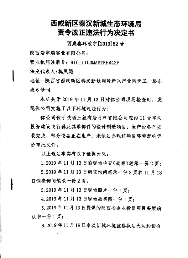 陕西浩宇瑞实业有限公司责令改正违法行为决定书