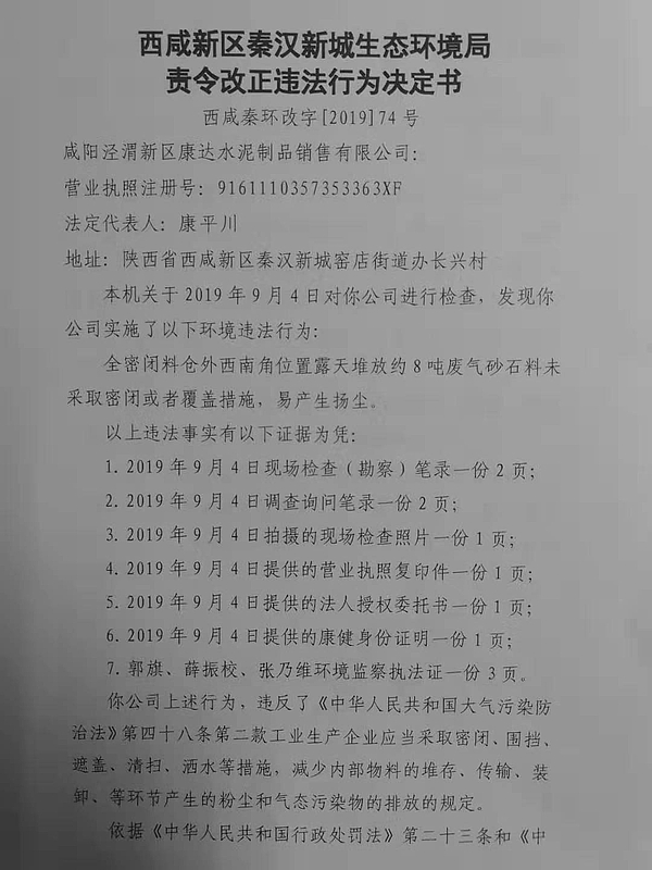 咸阳泾渭新区康达水泥制品销售有限公司责令改正违法行为决定书