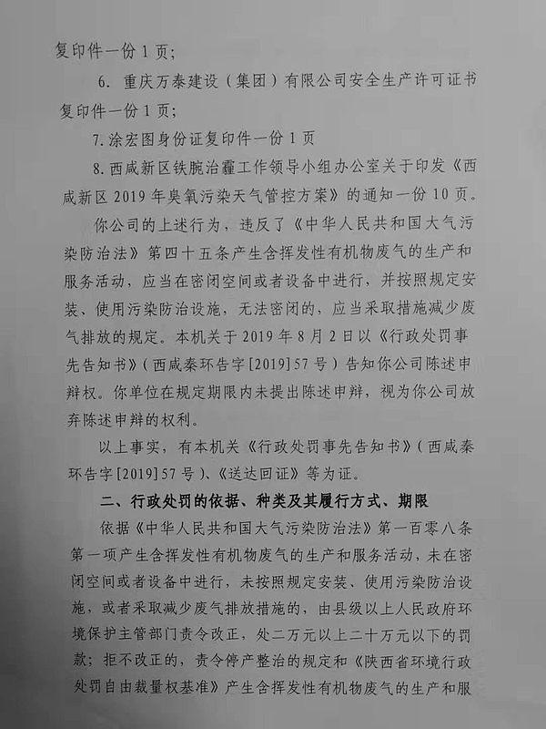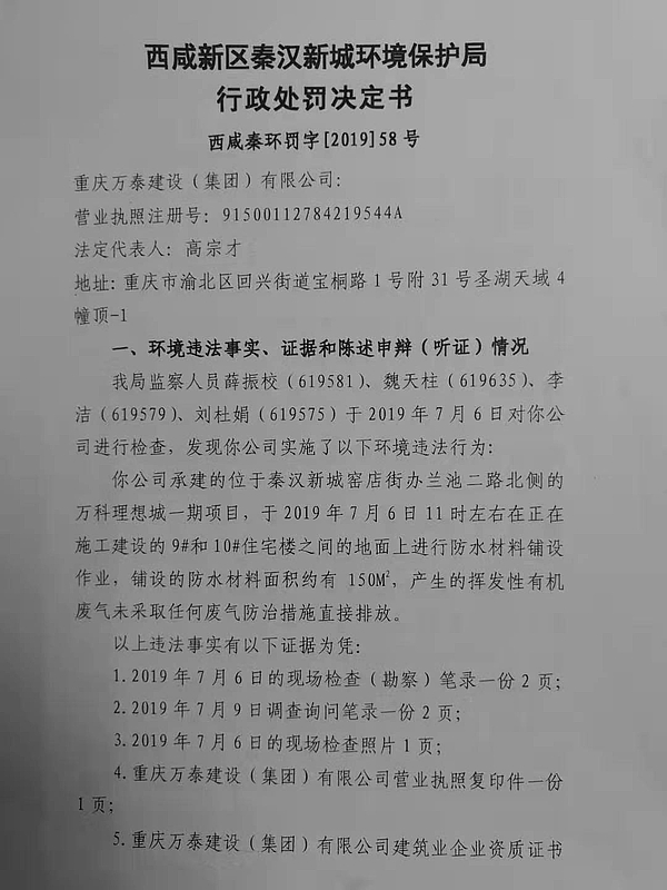重庆万泰建设(集团)有限公司行政处罚决定书