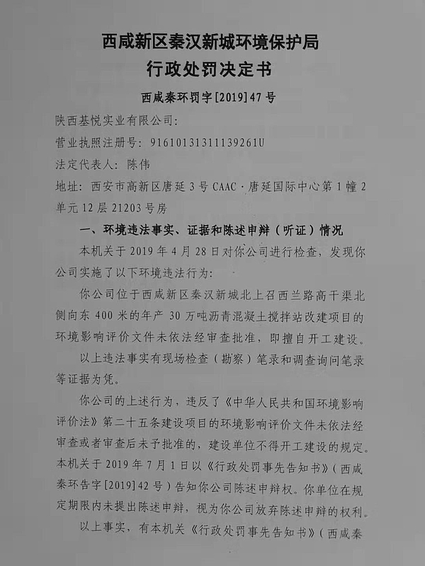 陕西基悦实业有限公司行政处罚决定书