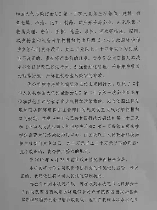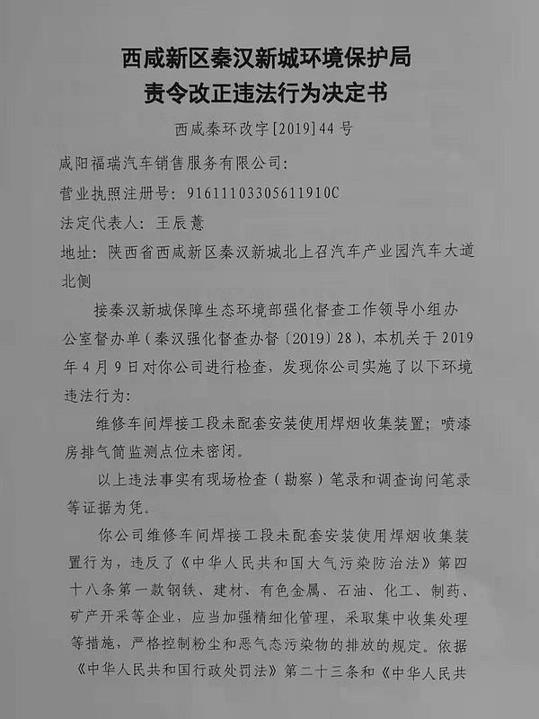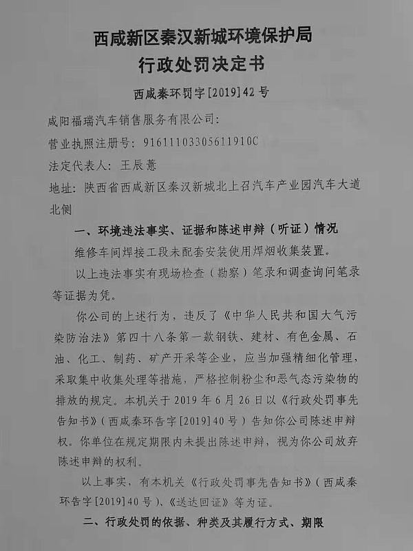 咸阳福瑞汽车销售服务有限公司行政处罚决定书