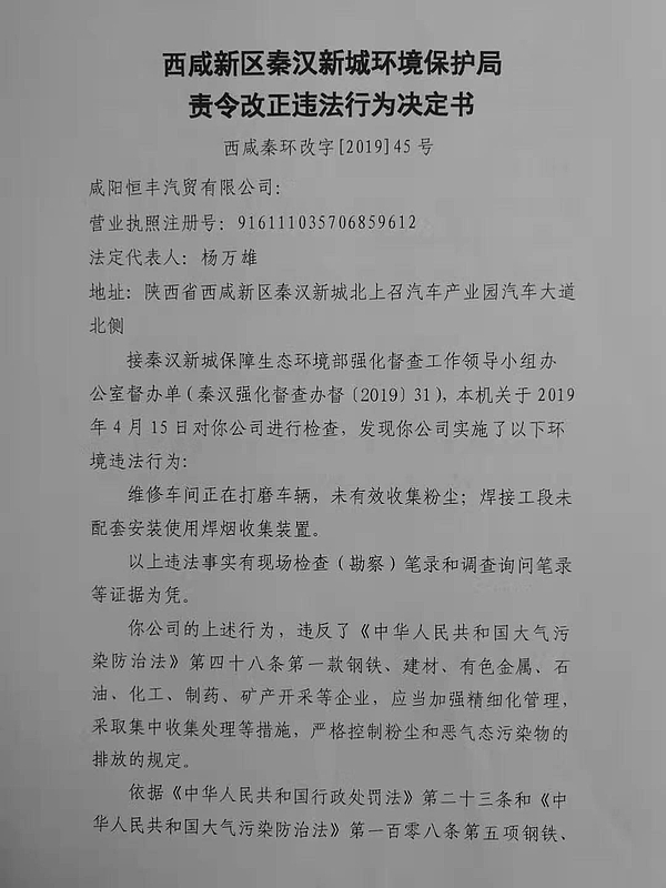 咸阳恒丰汽贸有限公司责令改正违法行为决定书