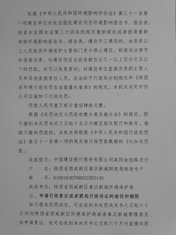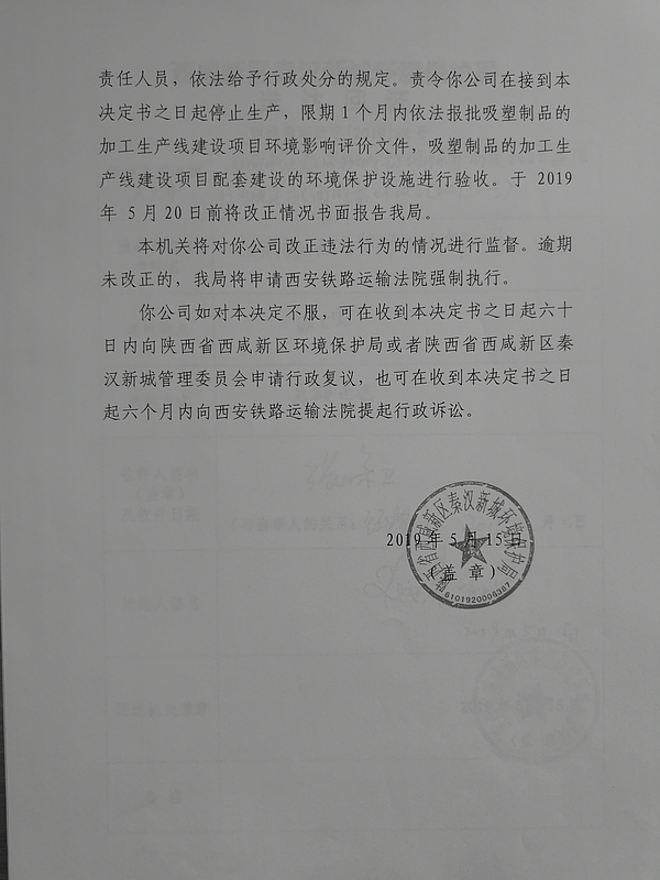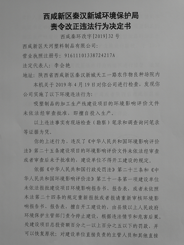西咸新区天河塑料制品有限公司行政处罚决定书