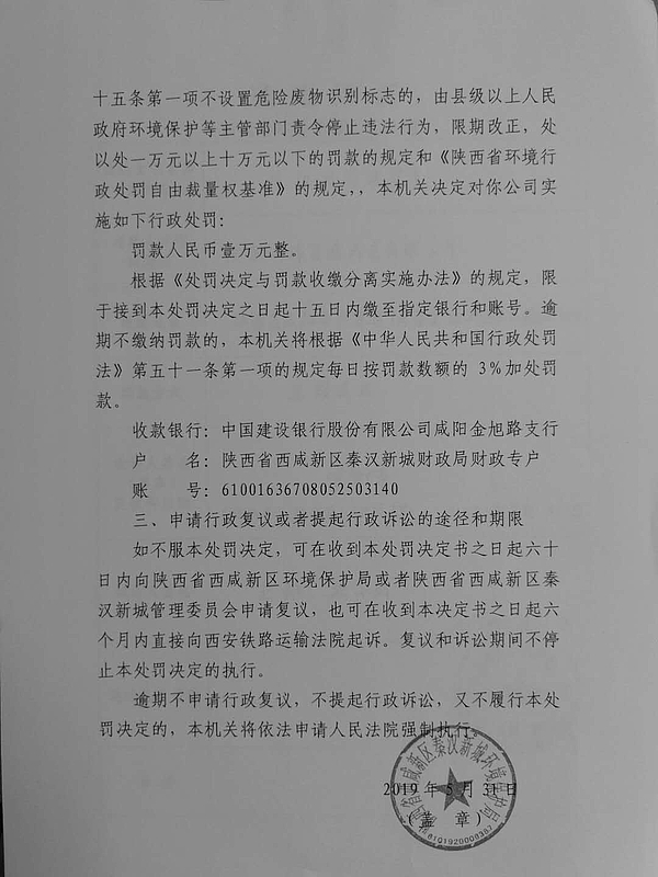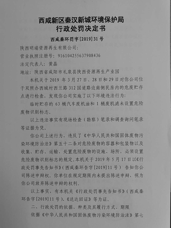 陕西明瑞资源再生有限公司行政处罚决定书