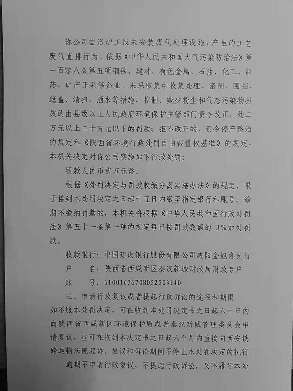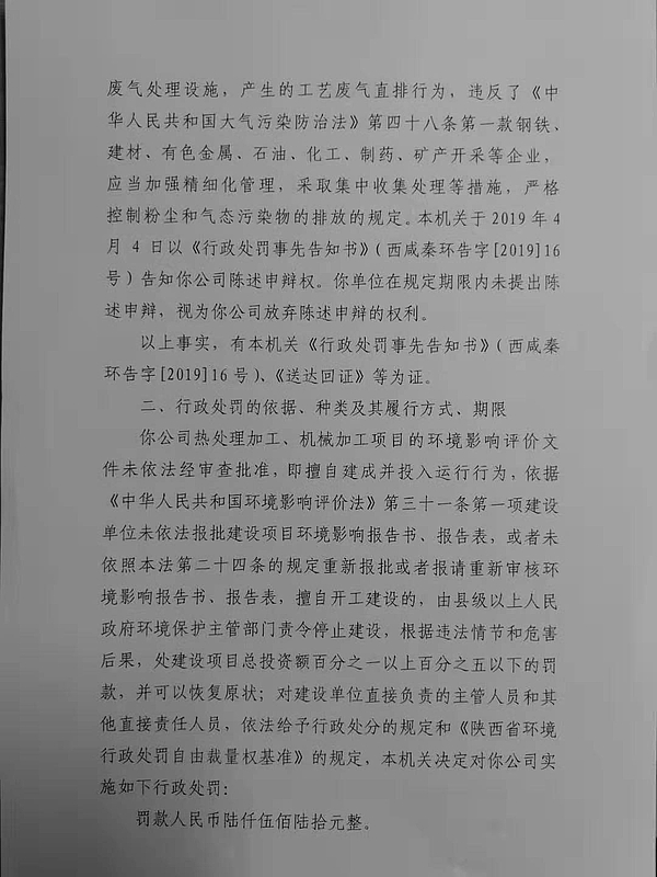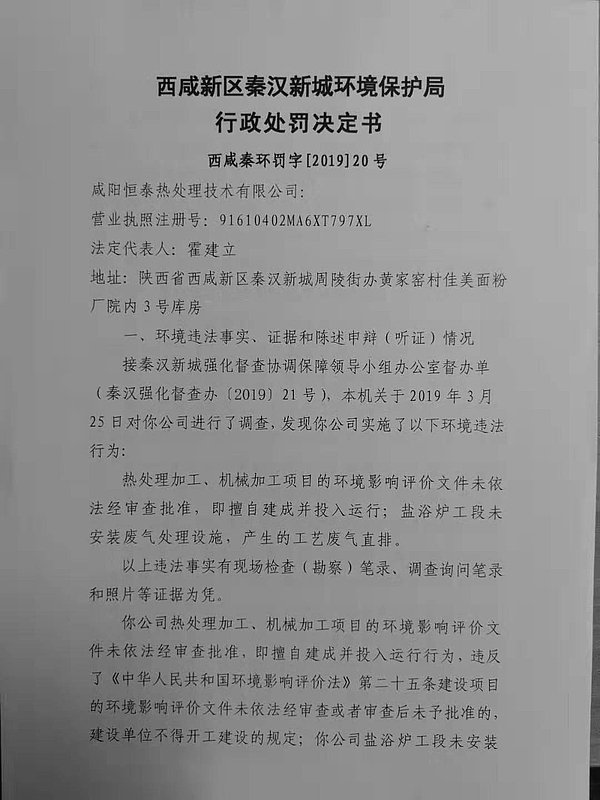 咸阳恒泰热处理技术有限公司行政处罚决定书