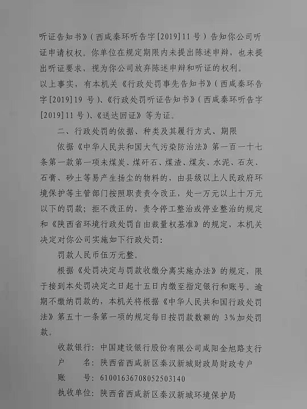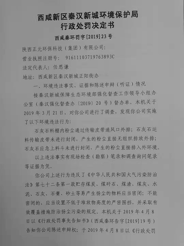 陕西正元环保科技(集团)有限公司行政处罚决定书