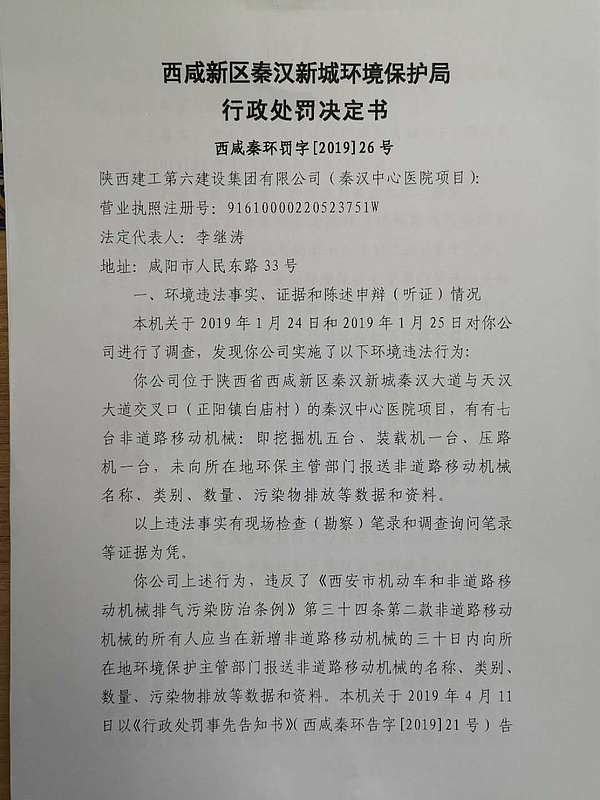 陕西建工第六建设集团有限公司(秦汉中心医院项目)行政处罚决定书