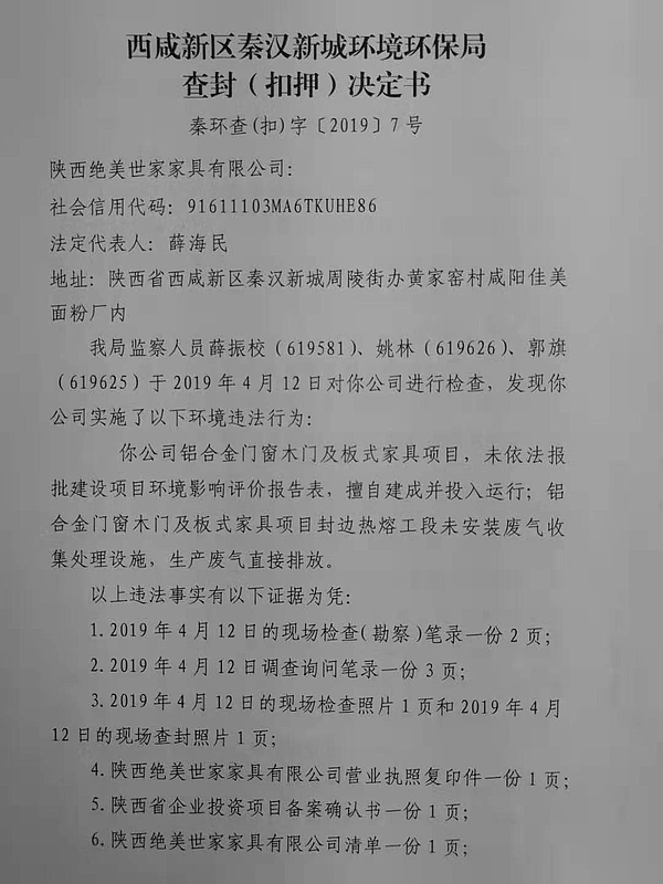 陕西绝美世家家具有限公司查封(扣押)决定书