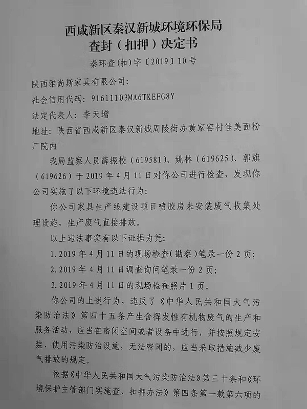陕西雅尚斯家具有限公司查封(扣押)决定书