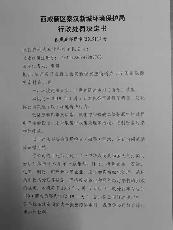 陕西威利达农业科技有限公司行政处罚决定书