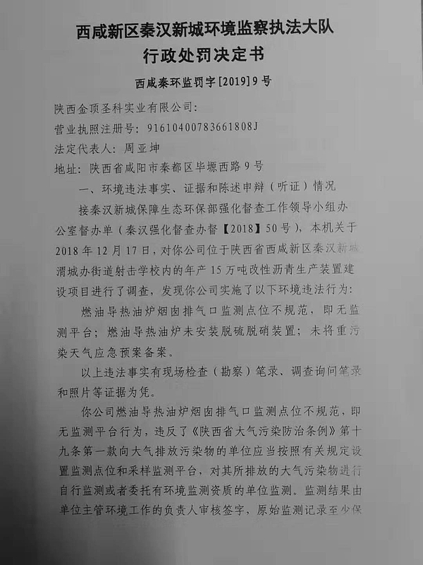 陕西金顶圣科实业有限公司行政处罚决定书