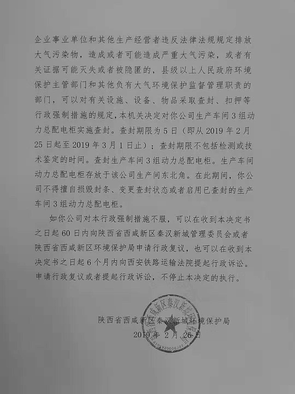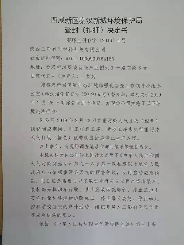 陕西三毅有岩材料科技有限公司查封(扣押)决定书
