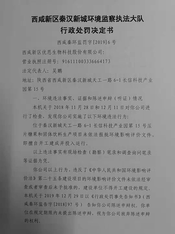 西咸新区优恩生物科技股份有限公司行政处罚决定书
