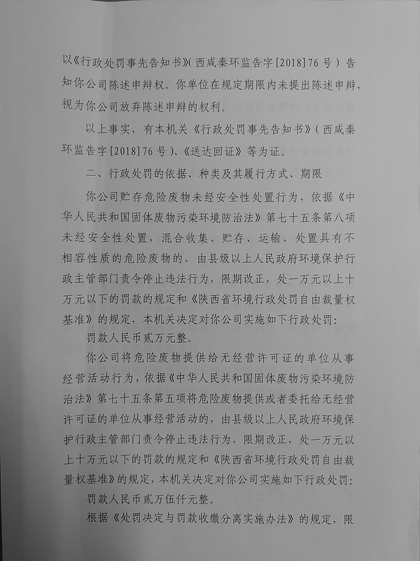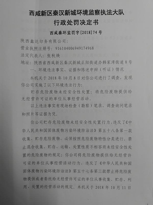 陕西鑫达印务有限公司行政处罚决定