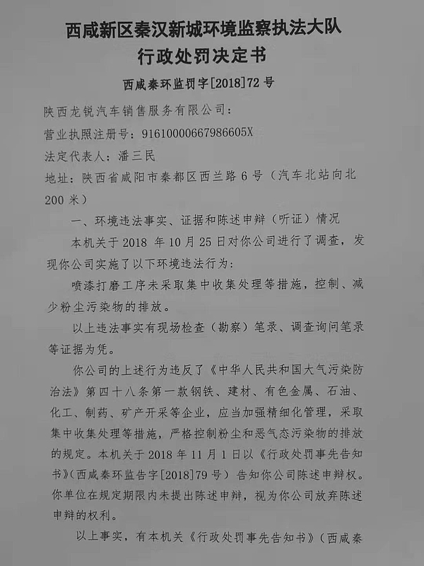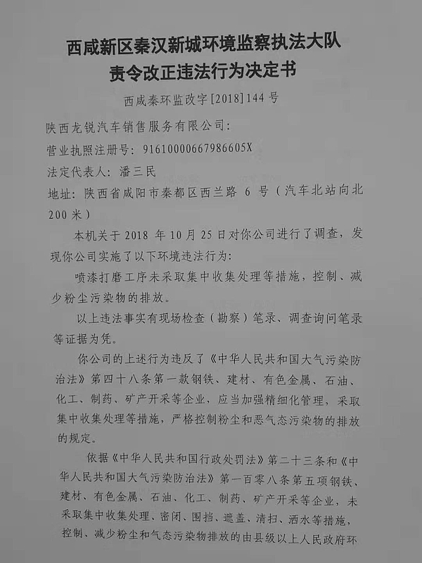 陕西龙锐汽车销售服务有限公司行政处罚决定书和责令改正违法行为决定书