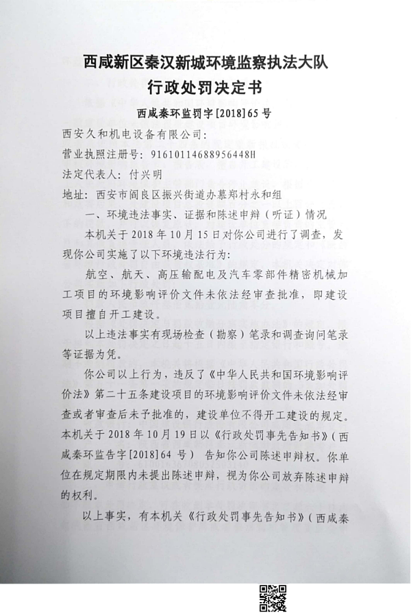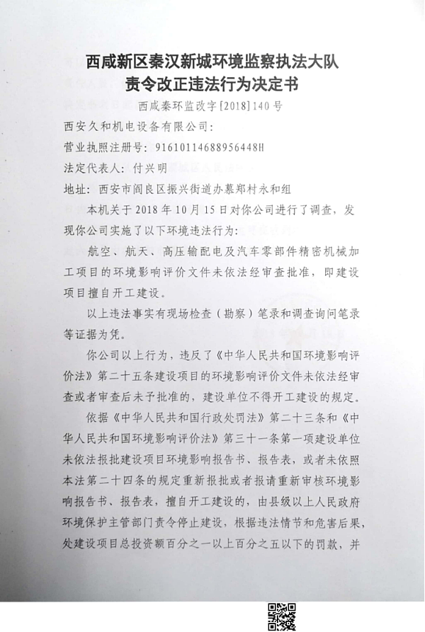 西安久和机电设备有限公司行政处罚决定书