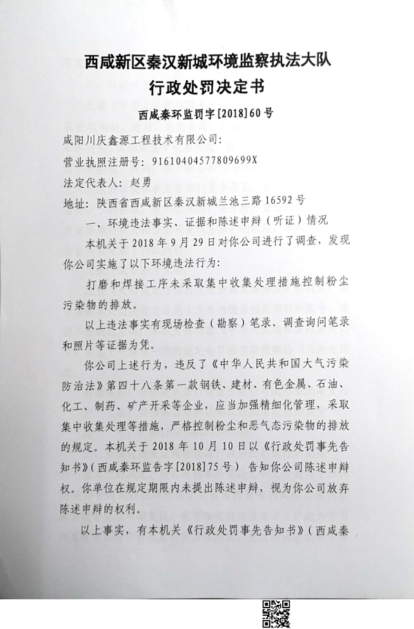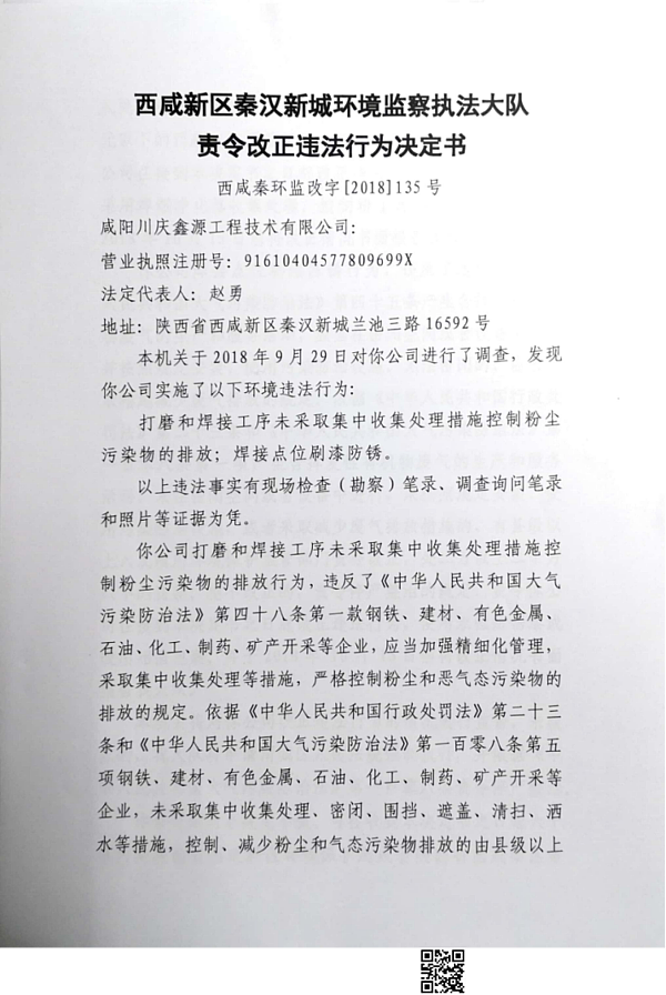 咸阳川庆鑫源工程技术有限公司行政处罚决定书