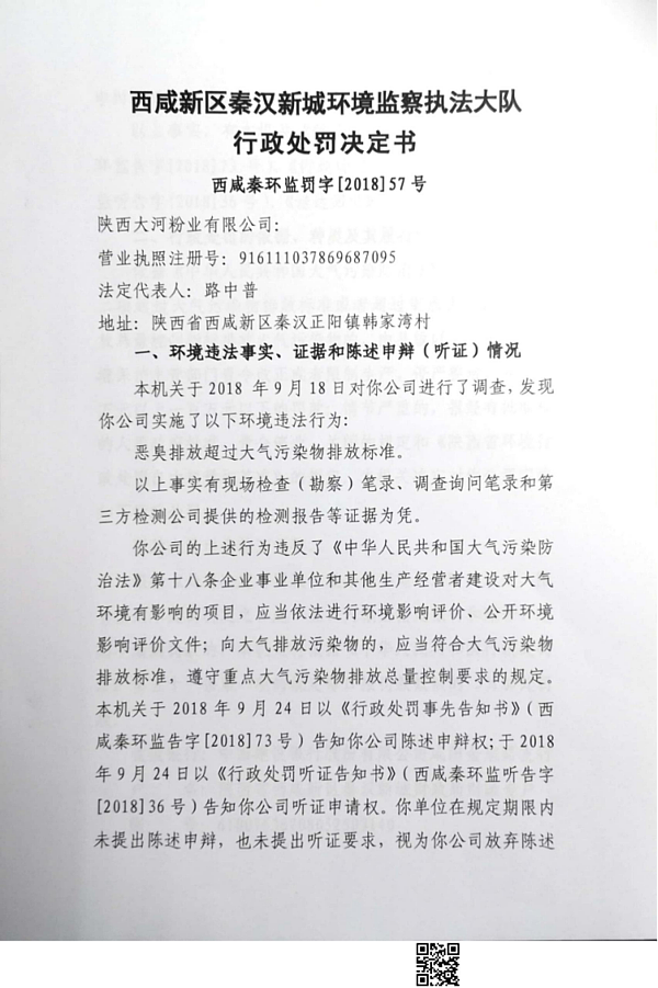 陕西大河粉业有限公司行政处罚决定书