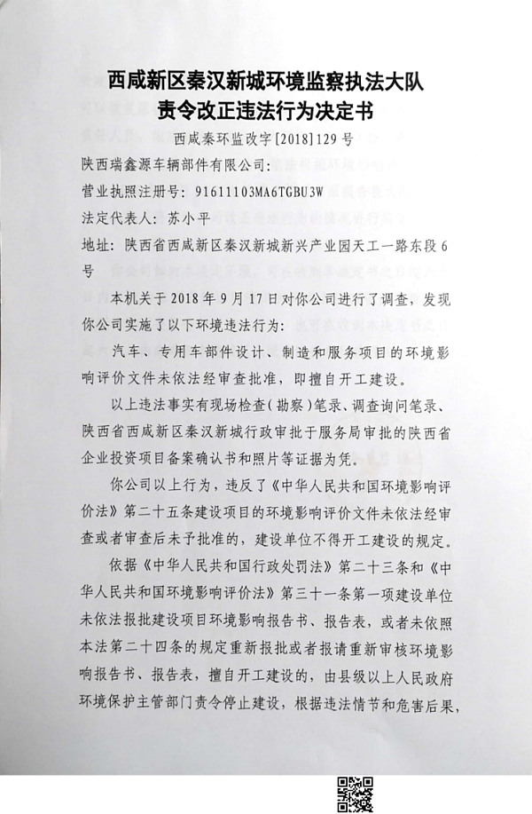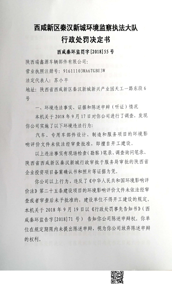 陕西瑞鑫源车辆部件有限公司行政处罚决定书