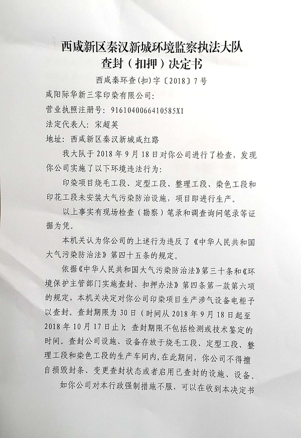 咸阳际华新三零印染有限公司查封(扣押)决定书