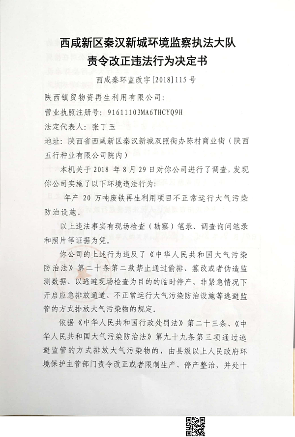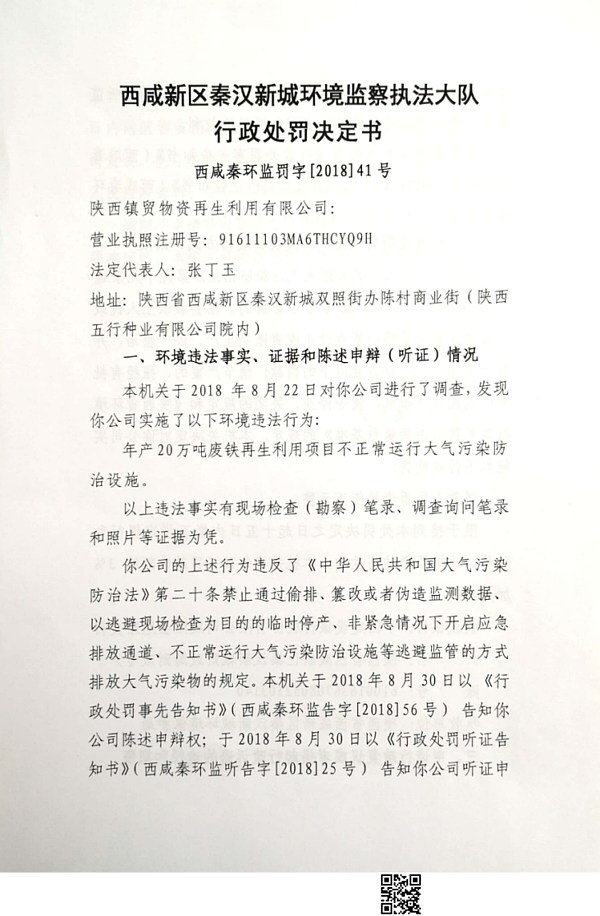 陕西镇贸物资再生利用有限公司行政处罚决定书