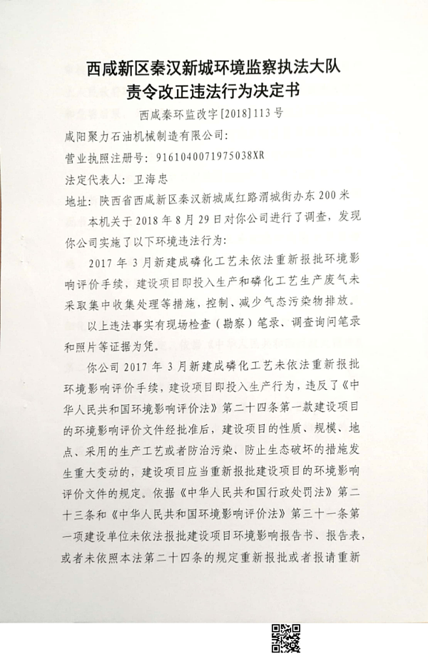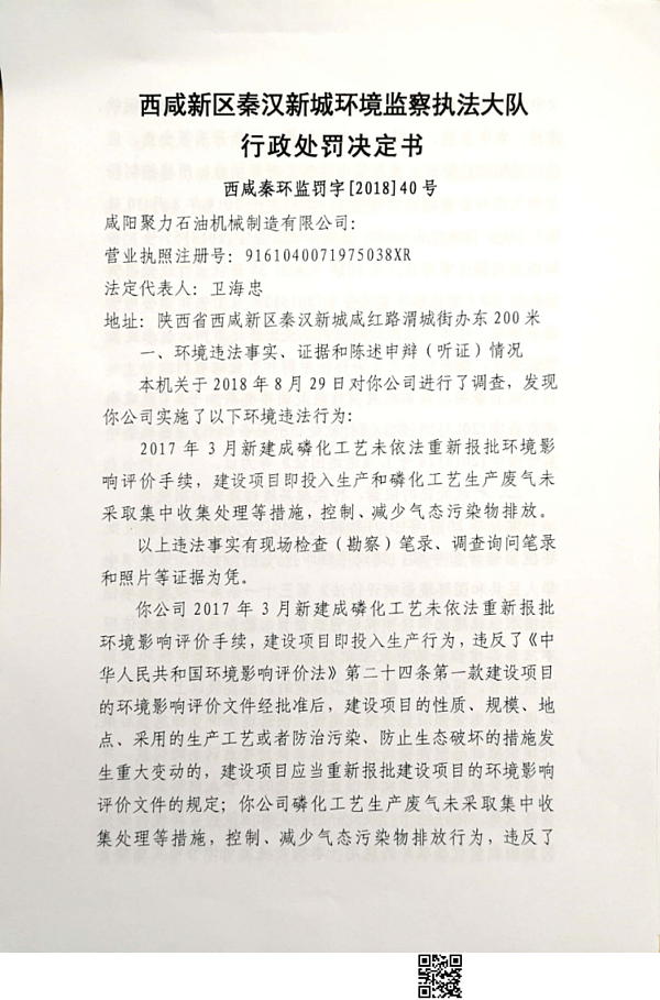 咸阳聚力石油机械制造有限公司行政处罚决定书