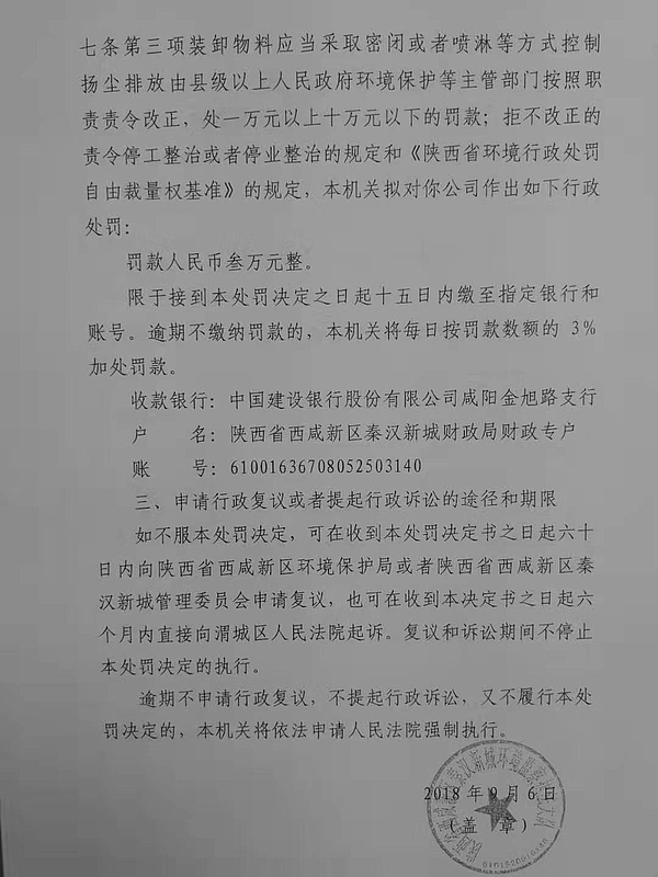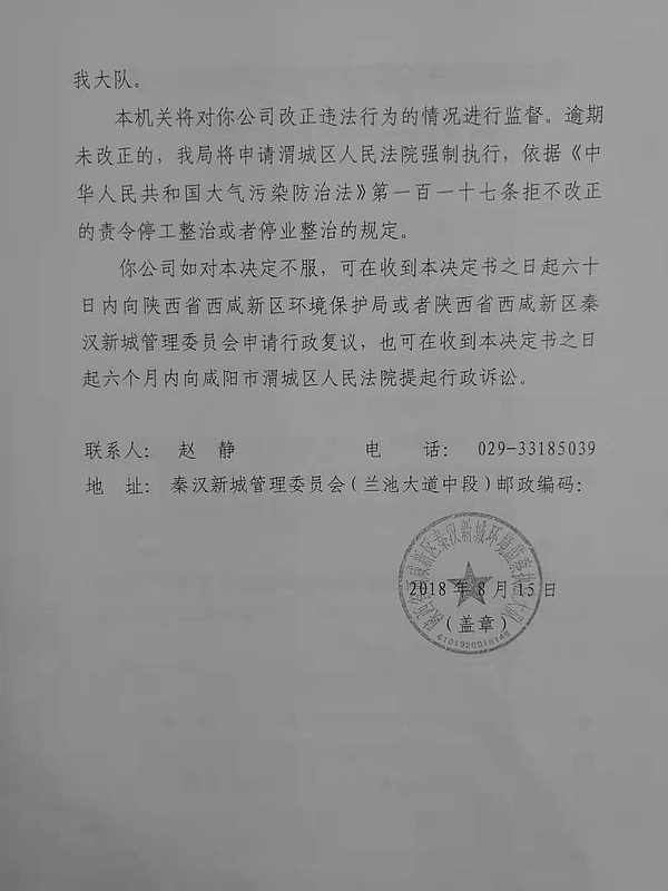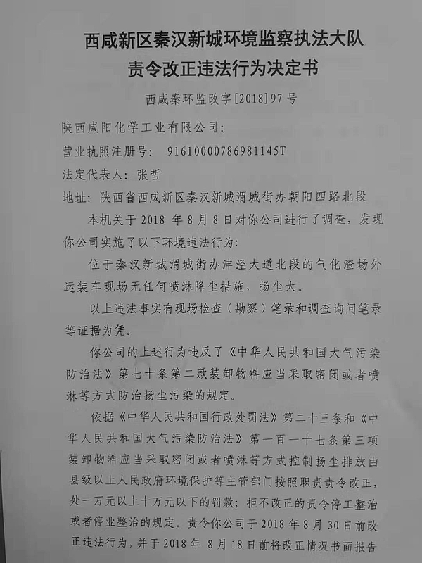 陕西咸阳化学工业有限公司行政处罚决定书和责令改正违法行为决定书