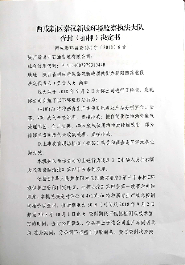 陕西新南方石油发展有限公司查封(扣押)决定书