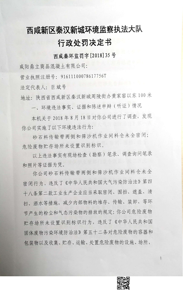 咸阳鼎立商品混凝土有限公司行政处罚决定书
