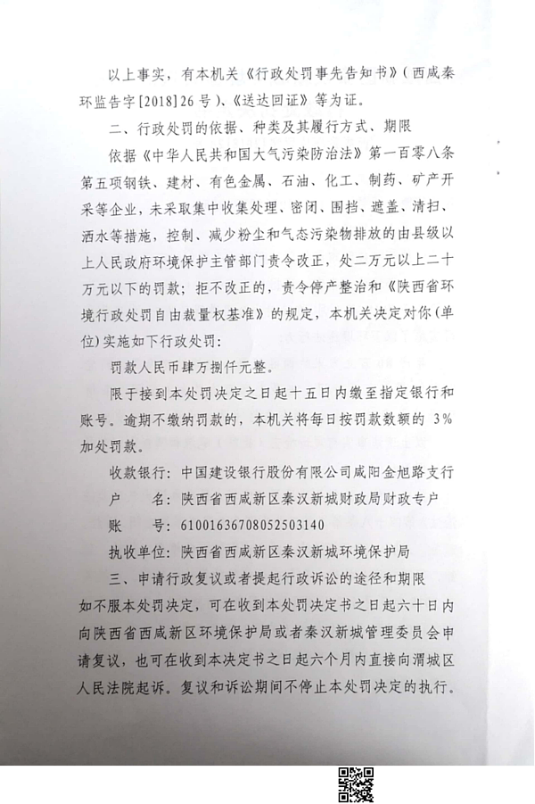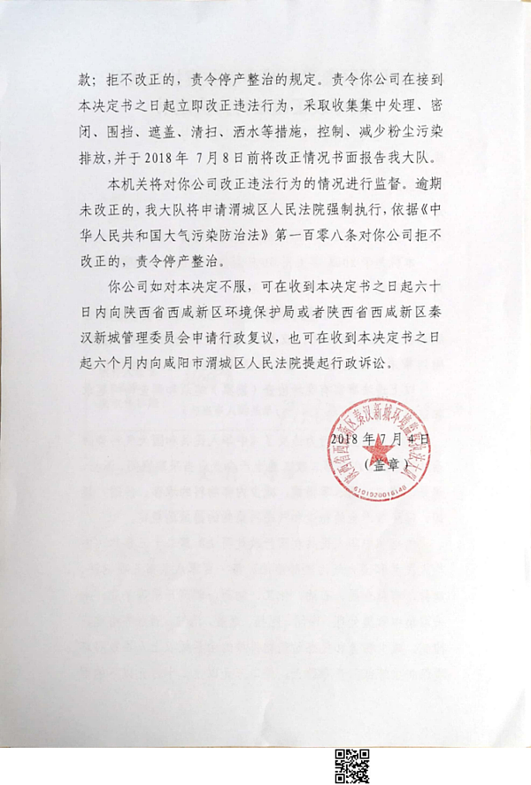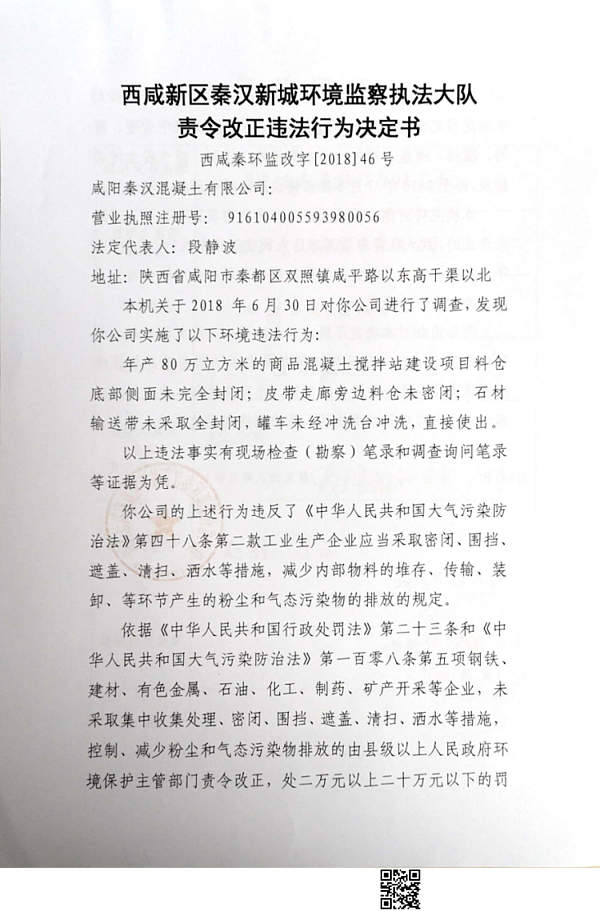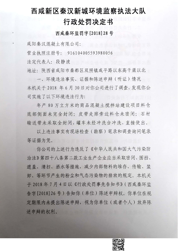 咸阳秦汉混凝土有限公司行政处罚决定书