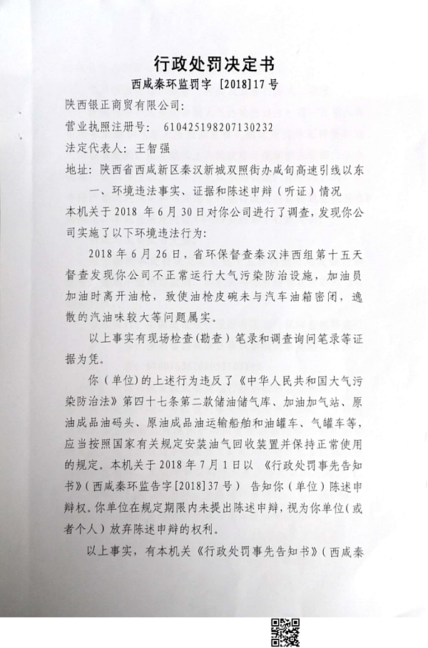 陕西银正商贸有限公司行政处罚决定书