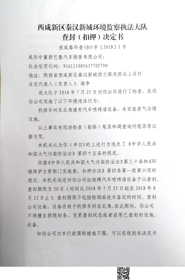 咸阳中冀斯巴鲁汽车销售有限公司查封(扣押)决定书