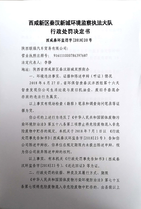 陕西联强汽车贸易有限公司行政处罚决定书