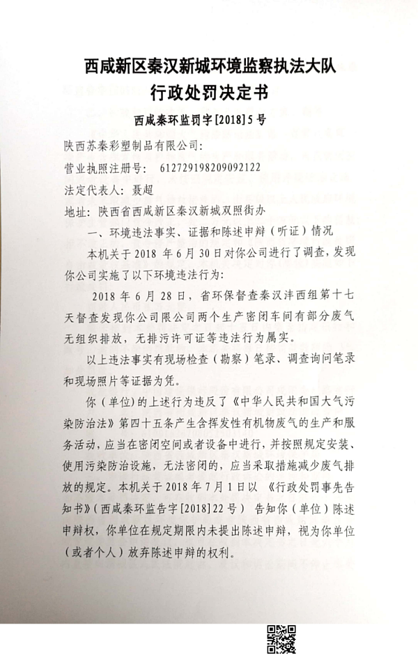 陕西苏秦彩塑制品有限公司行政处罚决定书