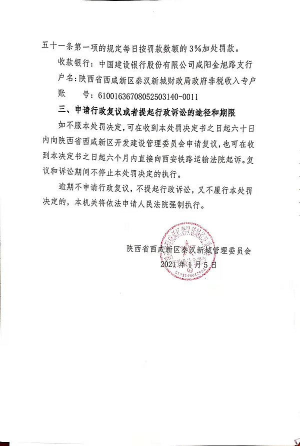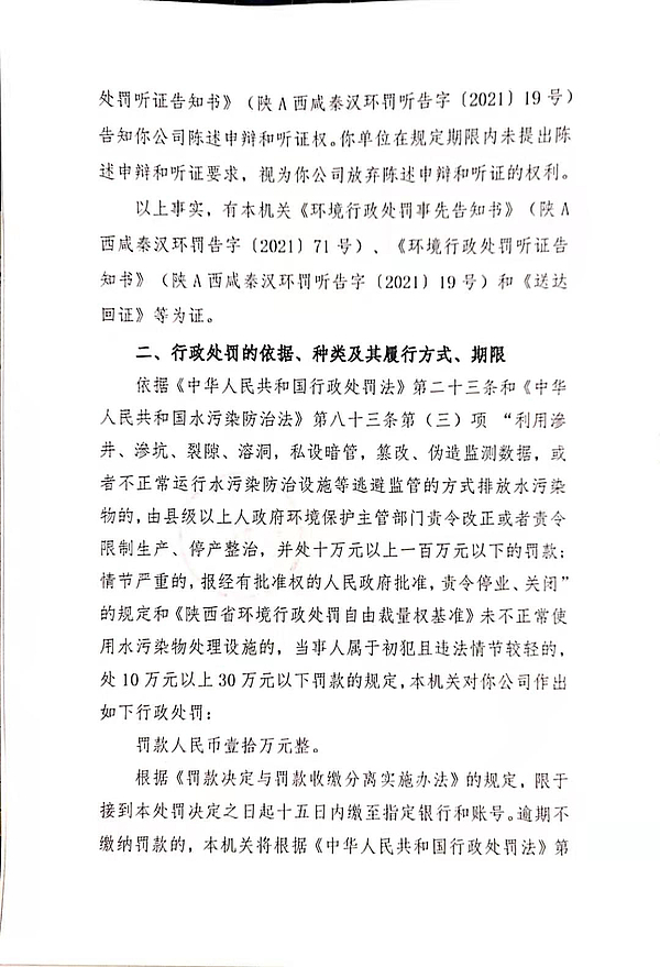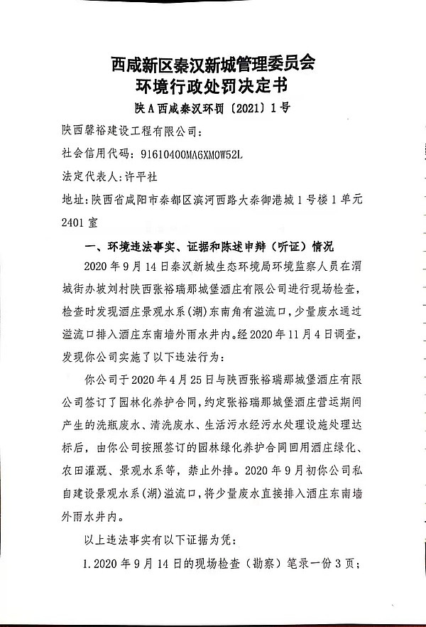 陕西馨裕建设工程有限公司环境行政处罚决定书
