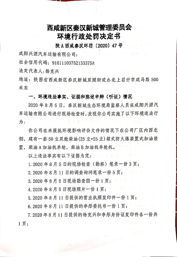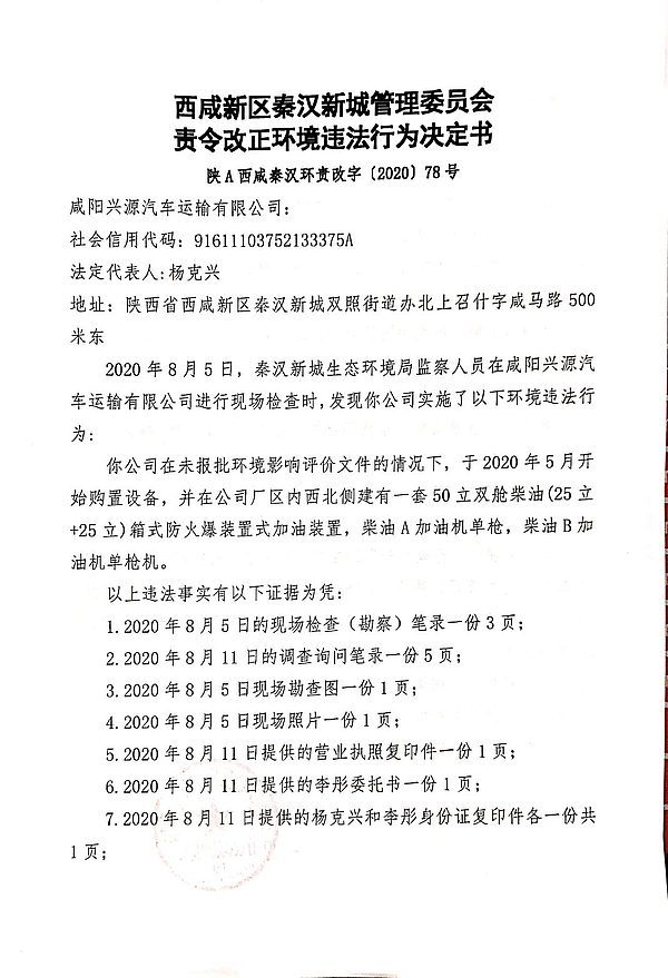 咸阳兴源汽车运输有限公司环境行政处罚决定书和责令改正环境违法行为决定书