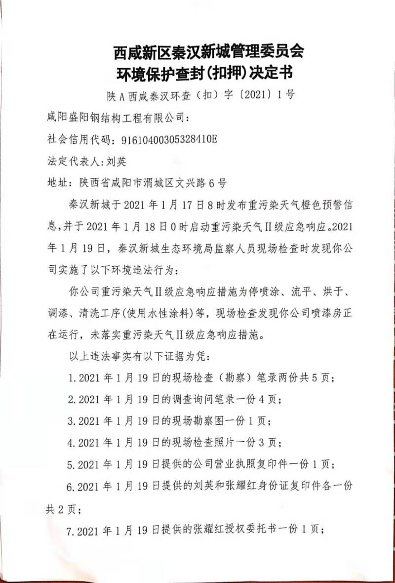 咸阳盛阳钢结构工程有限公司环境保护查封(扣押)决定书