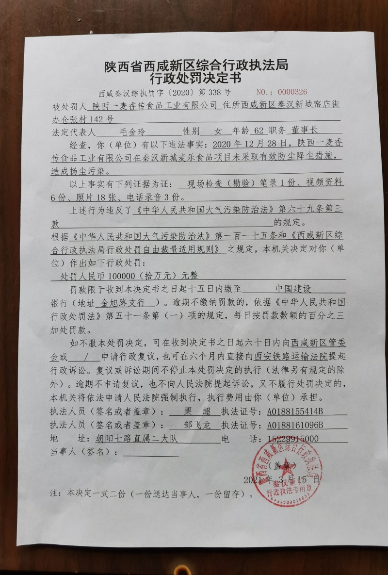 陕西省西咸新区综合行政执法局行政处罚决定书