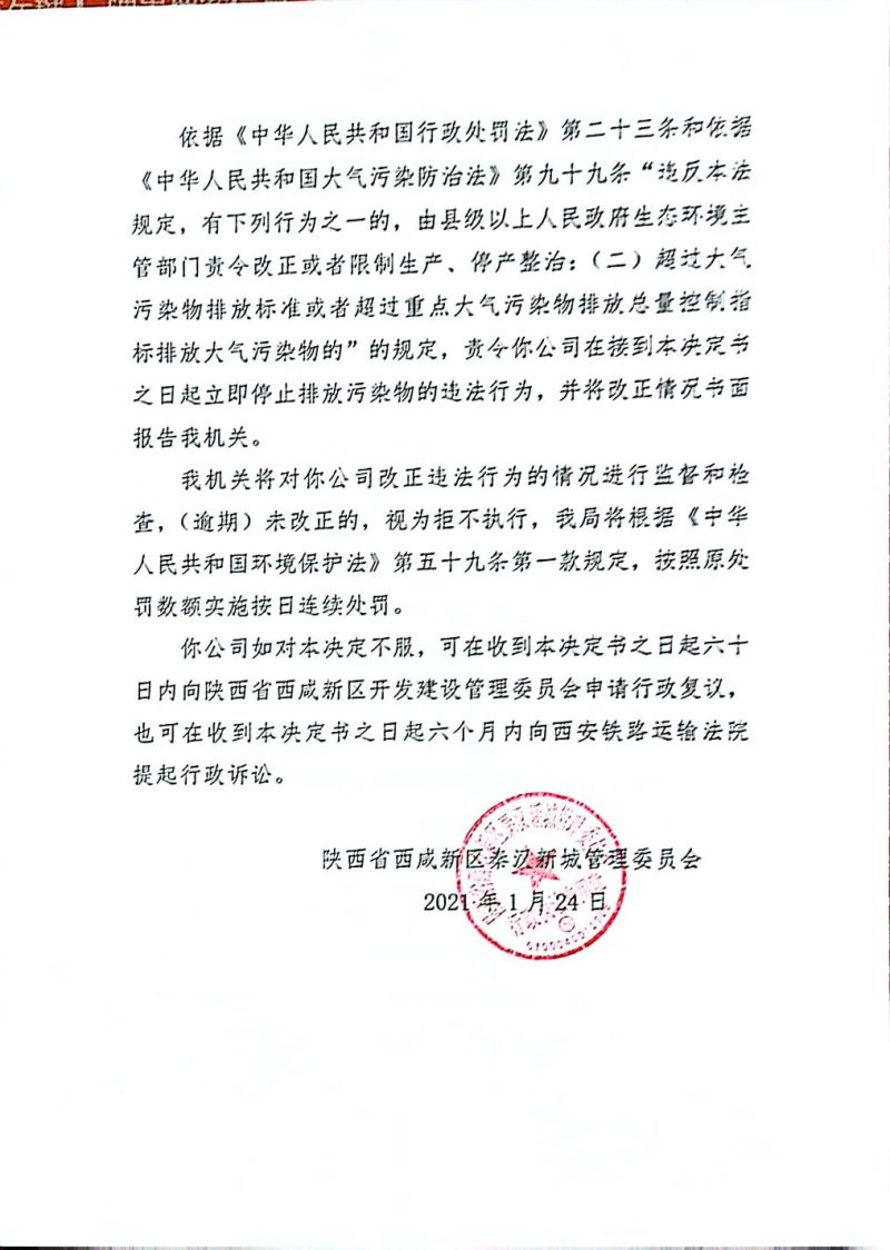 中玻(陕西)新技术有限公司责令改正环境违法行为决定书