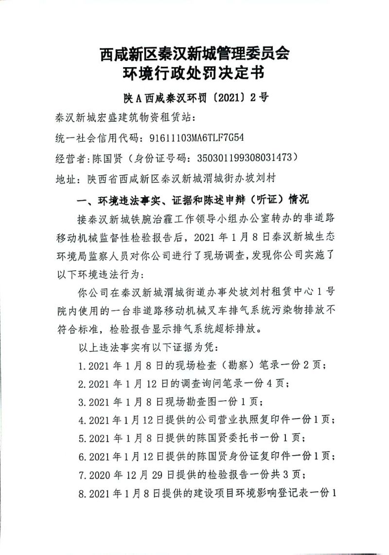 秦汉新城宏盛建筑物资租赁站环境行政处罚决定书