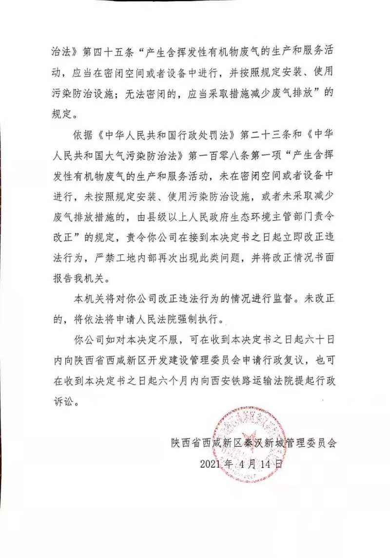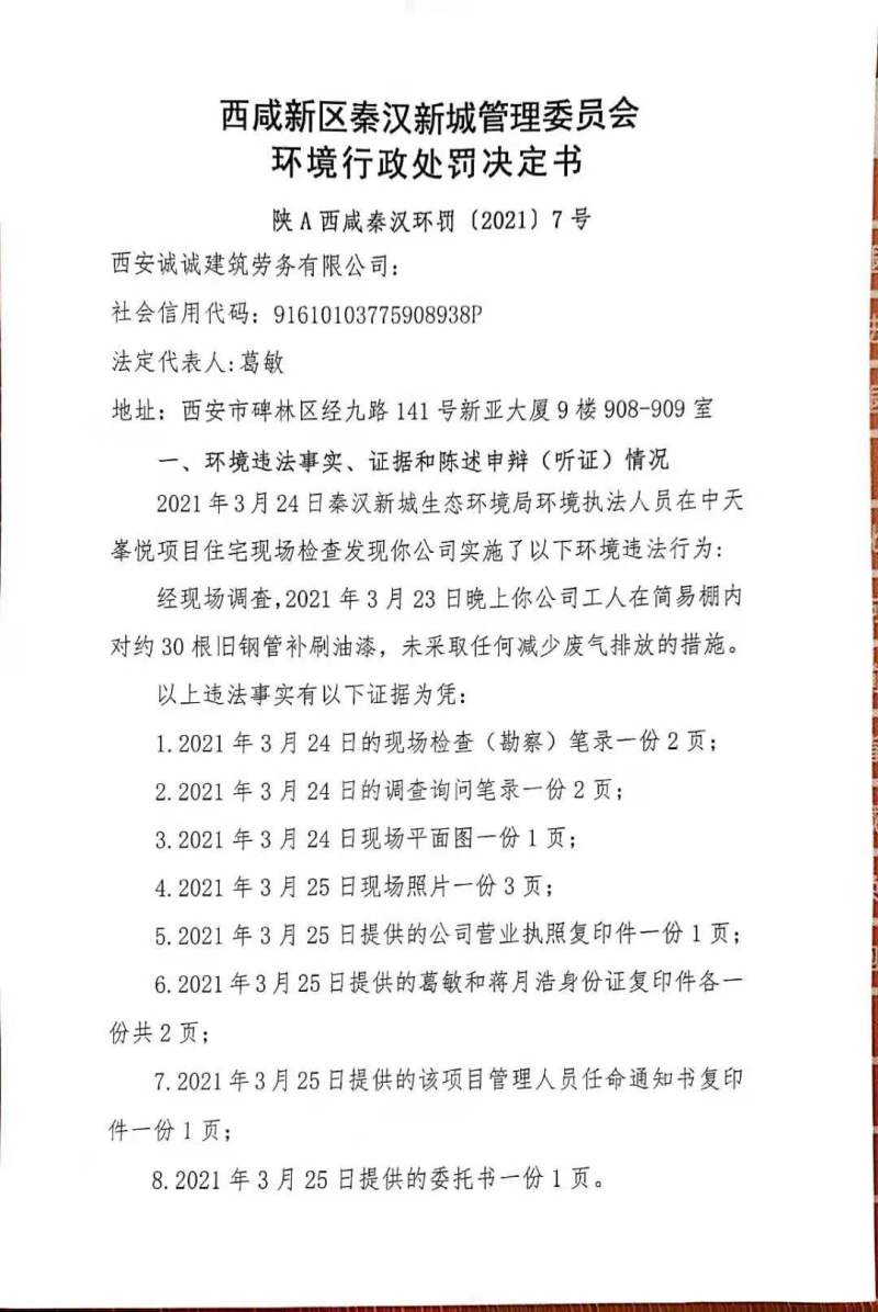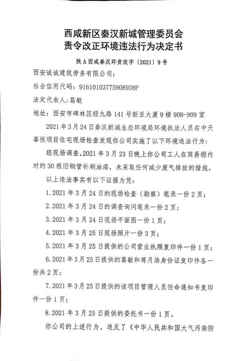 西安诚诚建筑劳务有限公司环境行政处罚决定书和责令改正环境违法行为决定书