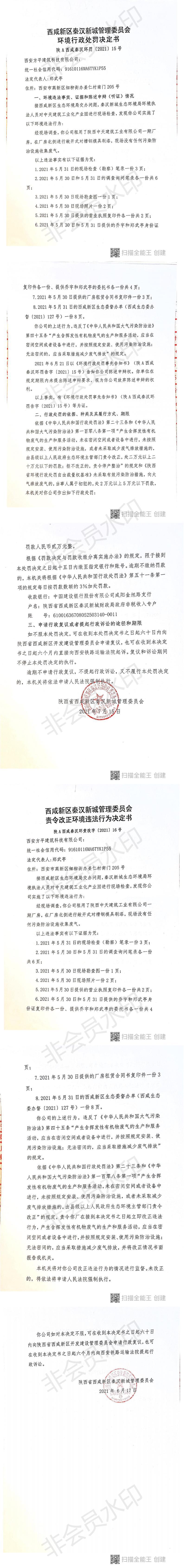西安方平建筑科技有限公司环境行政处罚决定书和责令改正环境违法行为决定书