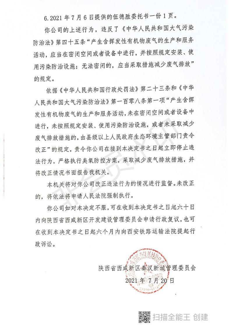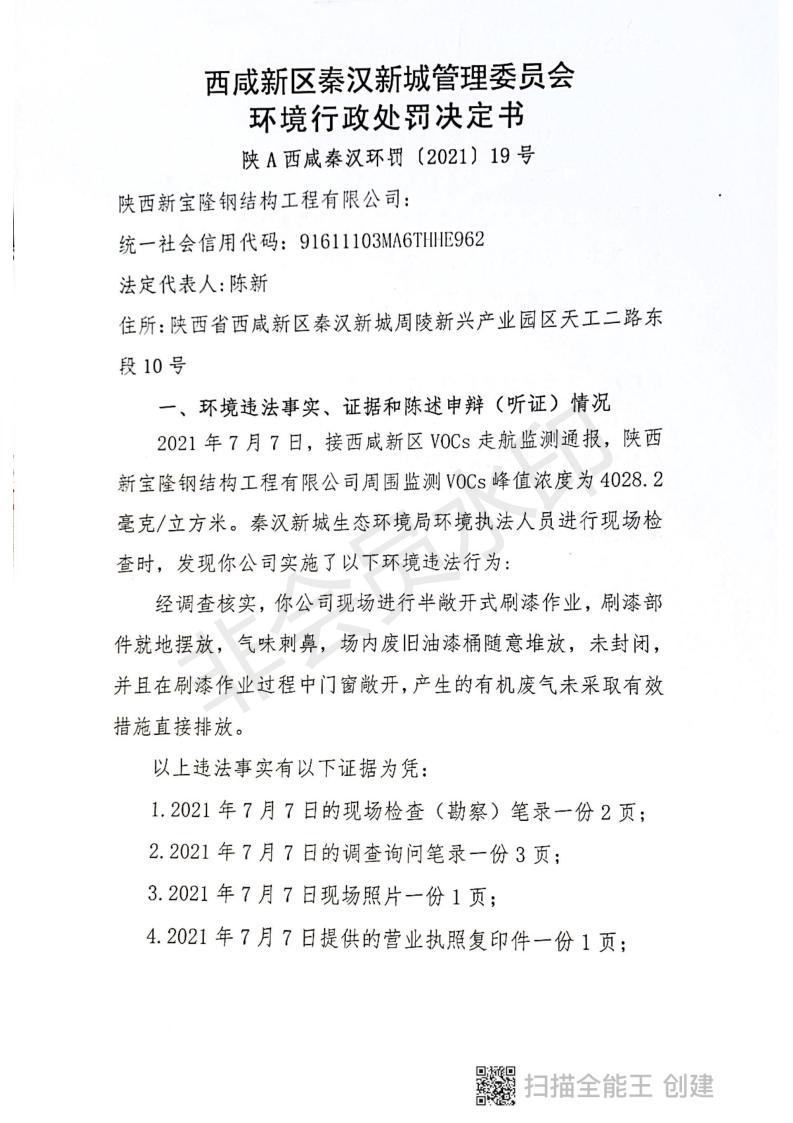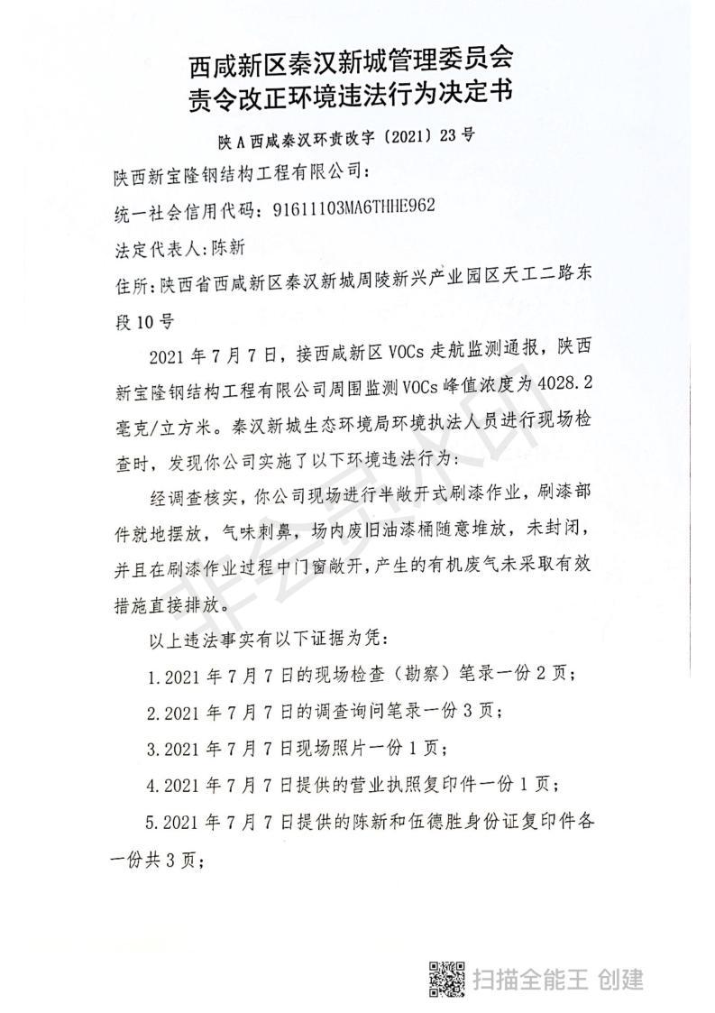 陕西新宝隆钢结构工程有限公司环境行政处罚决定书和责令改正环境违法行为决定书