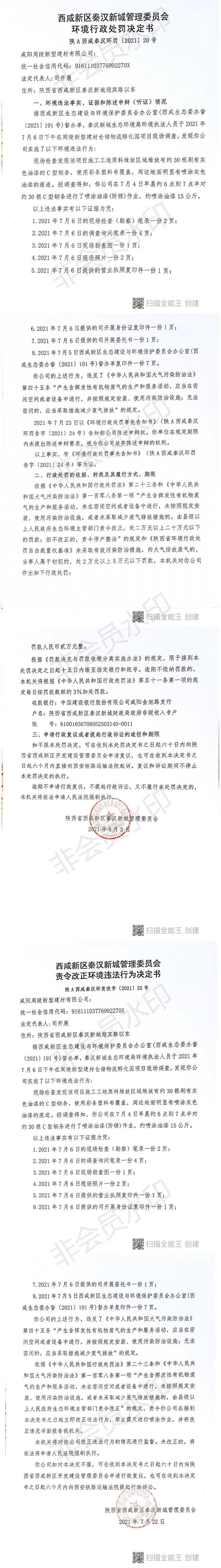 咸阳周陵新型建材有限公司环境行政处罚决定书和责令改正环境违法行为决定书