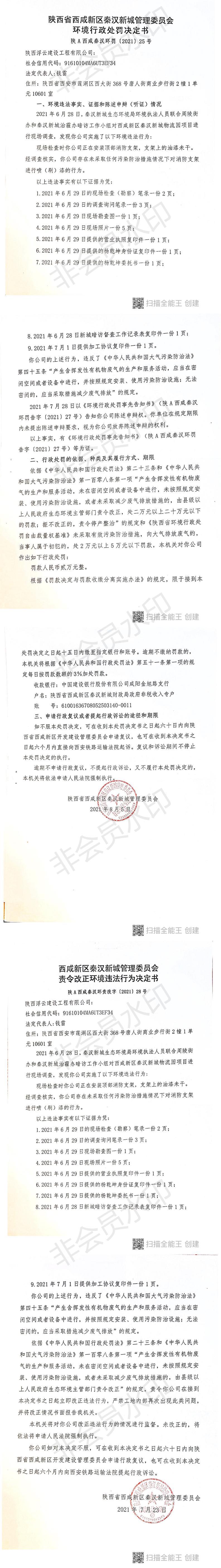 陕西浮云建设工程有限公司环境行政处罚决定书和责令改正环境违法行为决定书