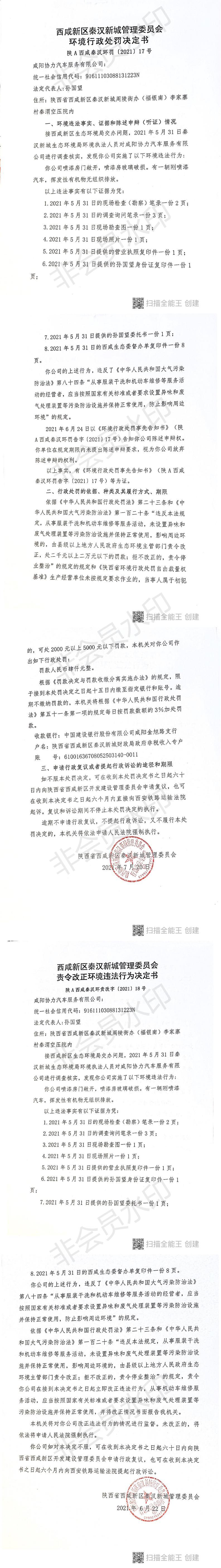 咸阳协力汽车服务有限公司环境行政处罚决定书和责令改正环境违法行为决定书