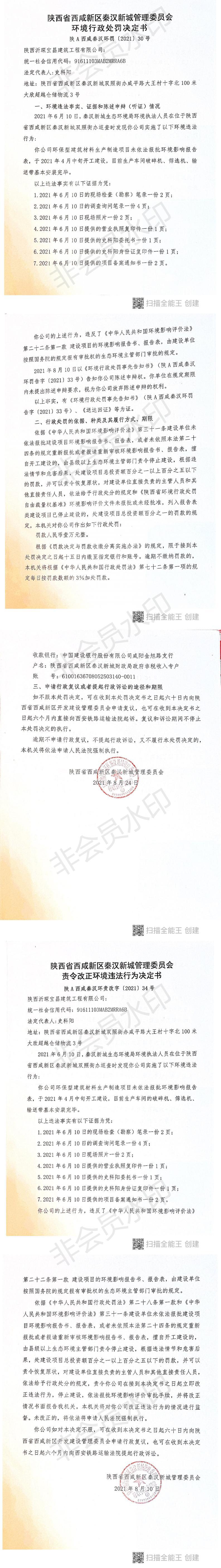陕西沂琛宝昌建筑工程有限公司环境行政处罚决定书和责令改正环境违法行为决定书