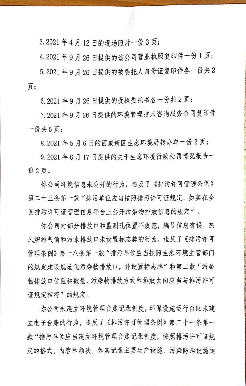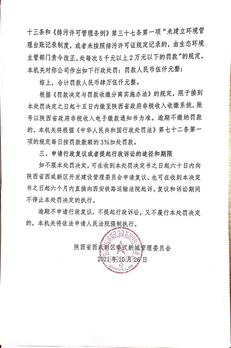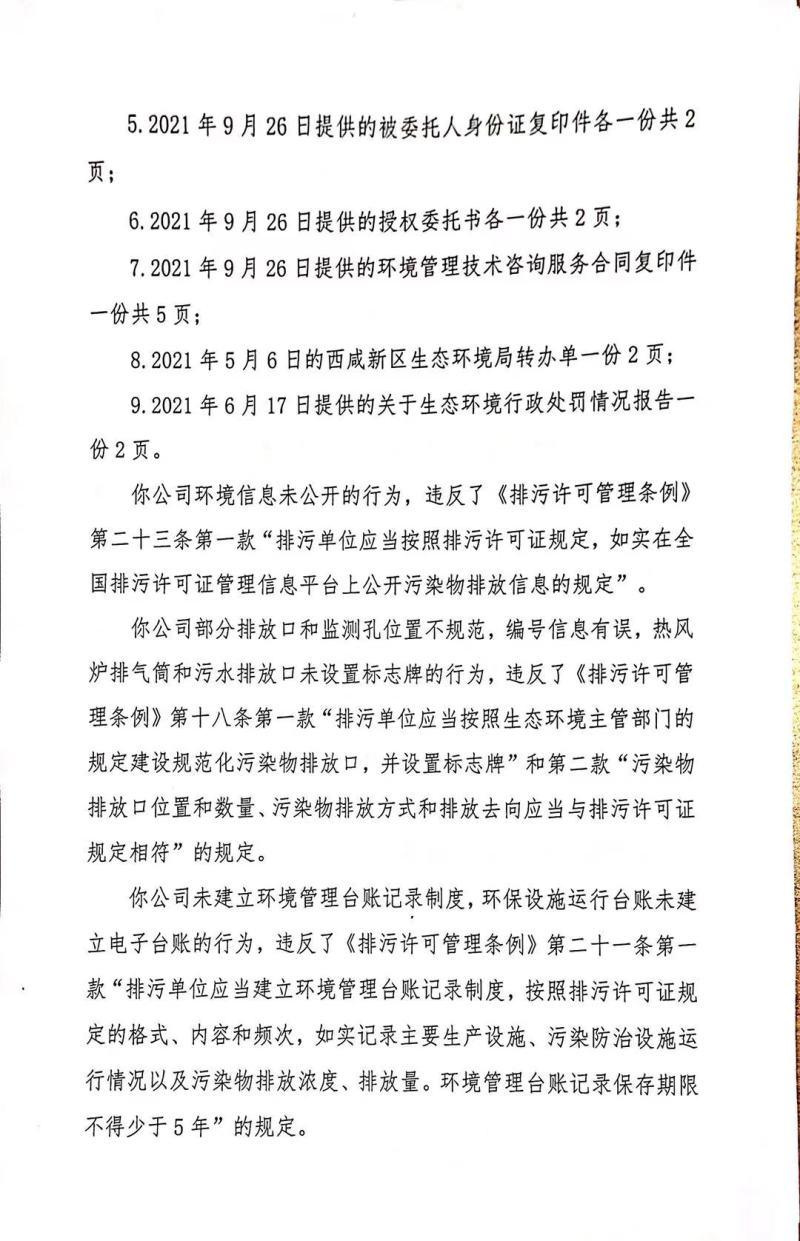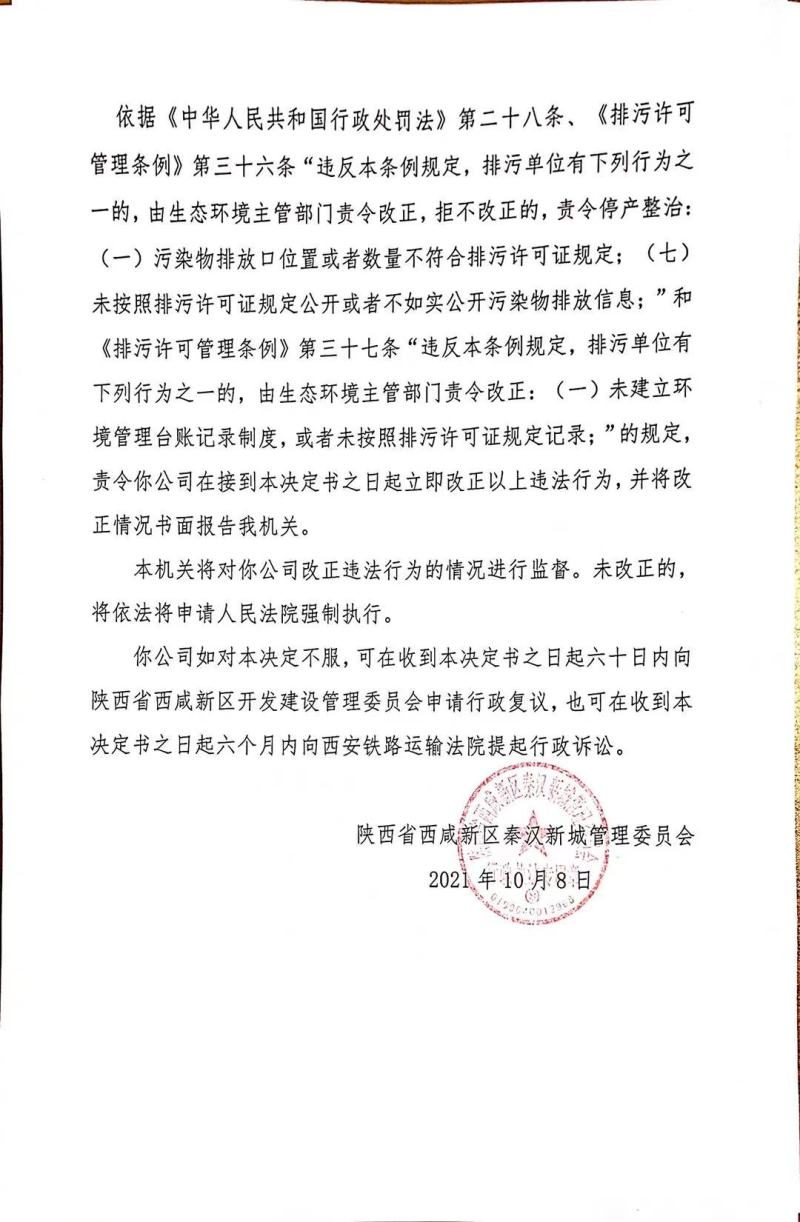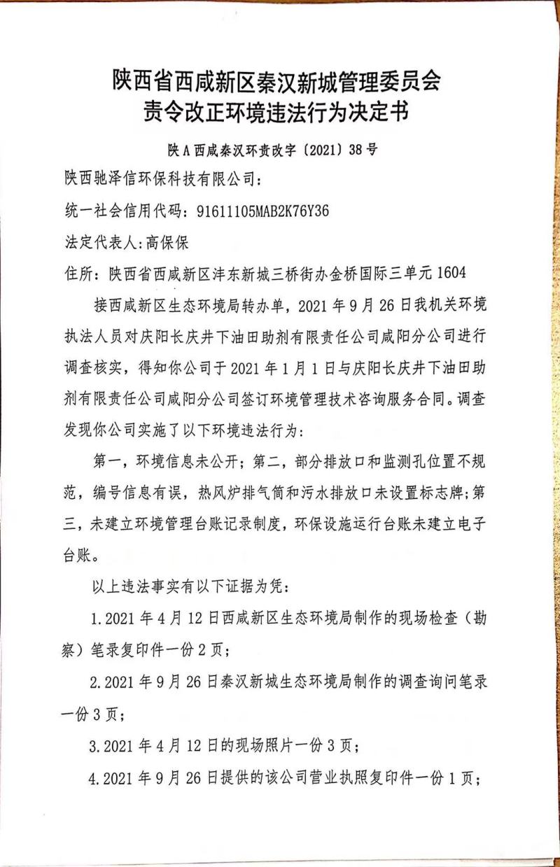 陕西驰泽信环保科技有限公司环境行政处罚决定书和责令改正环境违法行为决定书