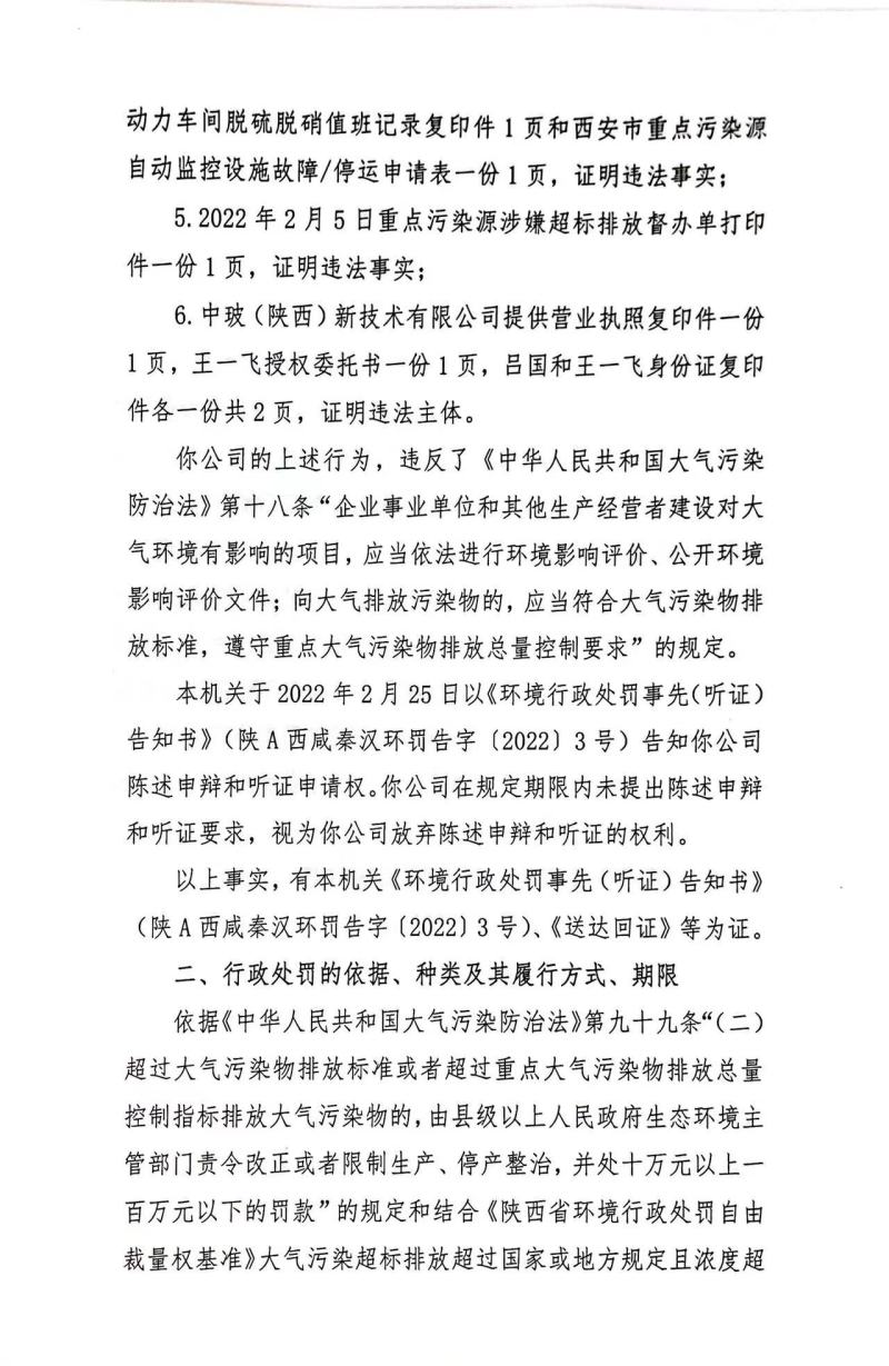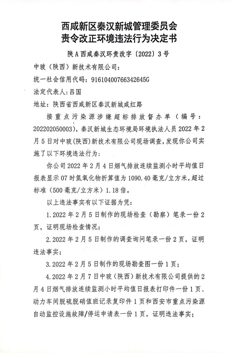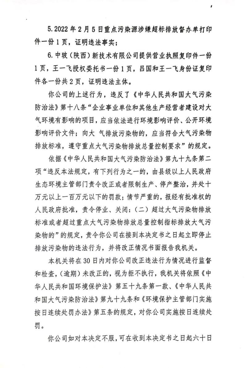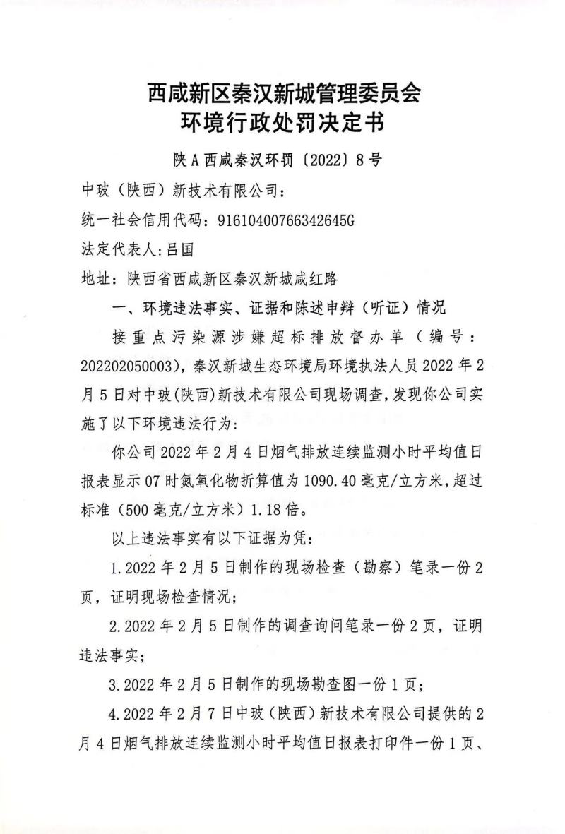 中玻(陕西)新技术有限公司环境行政处罚决定书和责令改正环境违法行为决定书
